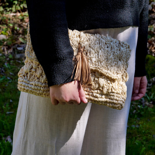 Pochette zippée en raphia nature, pompon naturel