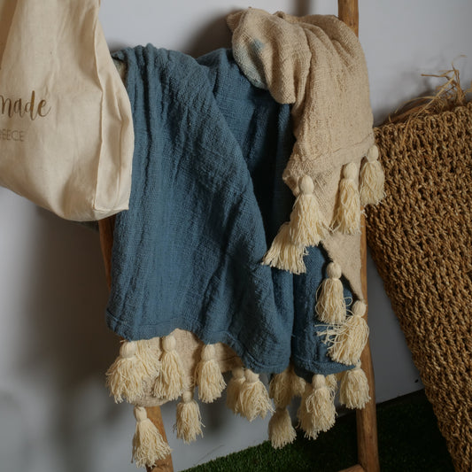 Plaid bleu vert-d'eau avec pompons 125*200