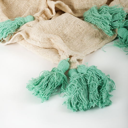 Plaid beige pompons bleu-vert d'eau 120*200