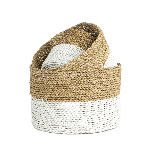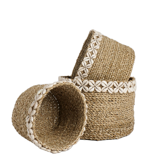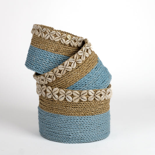 Petits paniers gigognes bleus et naturels avec couronne de coquillages