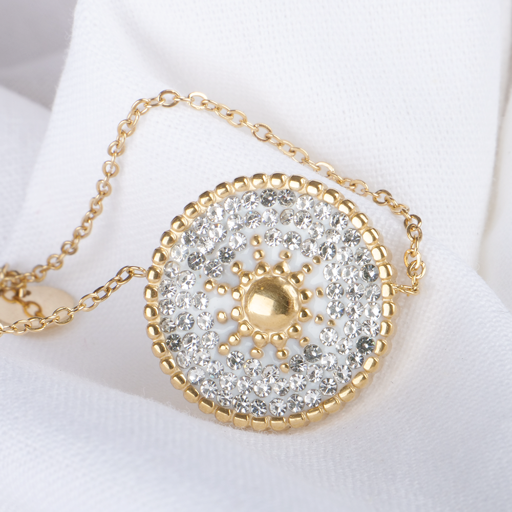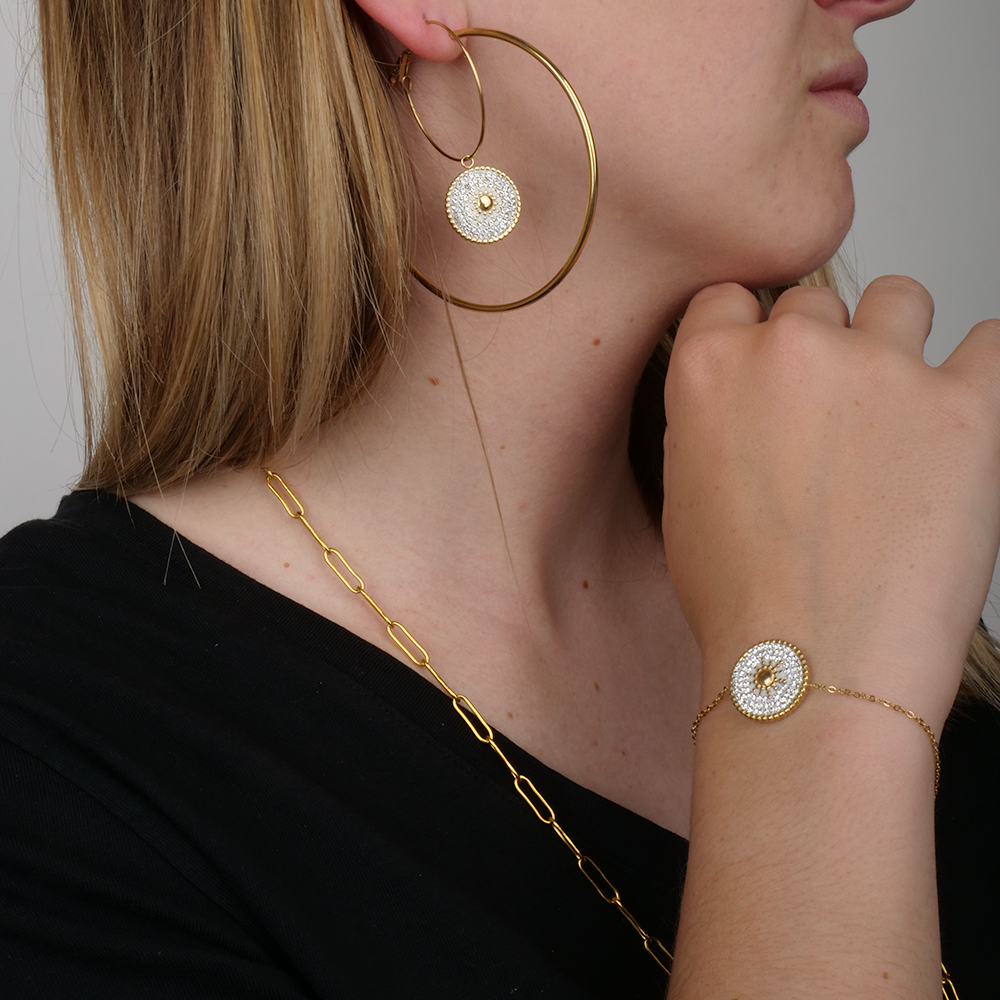 Découvrez notre magnifique bracelet à chaîne doré, doté d'un charmant centre rond représentant un soleil doré et orné de strass blancs. Ce bracelet est un accessoire élégant et étincelant qui ajoutera une touche de glamour à votre poignet.